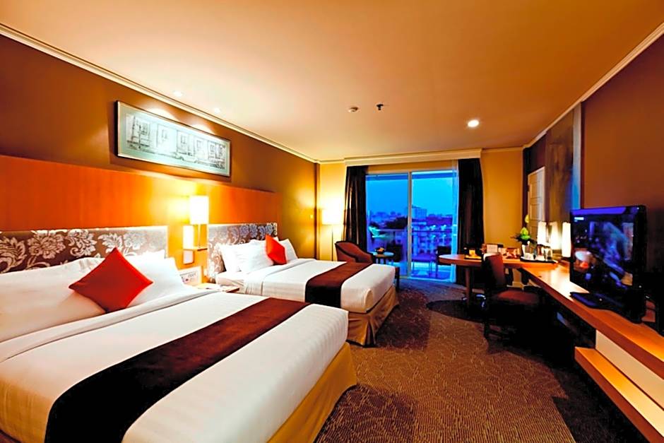 Deluxe is 366 square feet and includes either a queen-size bed 150-154 width or 2 single beds 80-130 width plus balcony.